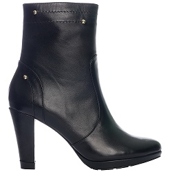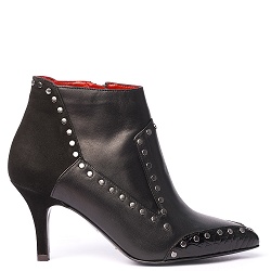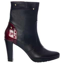 Halfhoge-laarzen Korte laars van zwart leer met rood lakleren accent op de hiel. Hakhoogte 7 cm. Rits aan de achterkant. Binnenzijde leer. Zeer comfortabele pasvorm.