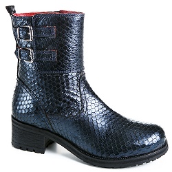 Halfhoge-laarzen Stoere biker boot van geweldig donker blauw leer met snakestructuur. Ze zitten zeer comfortabel en het zijn designer Colette’s persoonlijke favorieten. We hebben dit model in verschillende kleuren en leersoorten, maar deze licht glanzende blauwe leersoort is echt fantastisch! De maatvoering is ruim, geadviseerd wordt een maat kleiner te kiezen dan gebruikelijk. De binnenkant is ook van leer en de rits zit aan de binnenzijde. De stevige rubberen zool houdt je voeten droog.