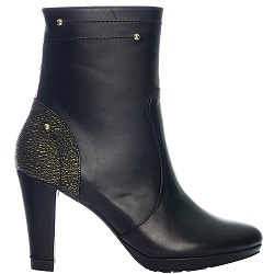 Halfhoge-laarzen Kittig laarsje van prachtig zwart leer met goudleren accent op de hiel en fijne gouden knopjes. Hakhoogte 7 cm. Rits aan de achterkant. Binnenzijde is ook van leer. Zeer comfortabele pasvorm en toch heel sexy.