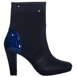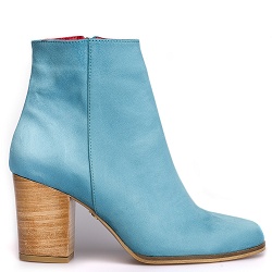 Halfhoge-laarzen Kort laars van blauw nubuck met hiel accent van blauw lakleer. Hakhoogte 7 cm. Rits aan de achterkant. Binnenzijde leer. Zeer comfortabele pasvorm.