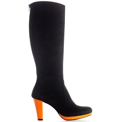 Hoge-laarzen Lange zwart suede laars met oranje leren platform en hak. Rits aan de achterkant. Hakhoogte 7 cm. Binnenzijde leer. Kuitomtrek 40 cm bij maat 39. Kleinere maten smaller, grotere maten breder. Elastiek aan bovenzijde voor extra ruimte indien nodig.