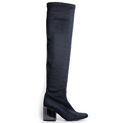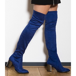 Hoge-laarzen Überhip dit najaar! Over de knie laars met elastische schacht van marine stretch suede. Hak is 4 cm hoog. Zeer modieus en ook zeer comfortabel. Te gek in combinatie met een jas van trendy nepbont.