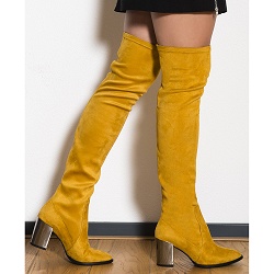 Hoge-laarzen Dit model is een blijvertje! Over de knie laars met elastische schacht van oker stretch suede. Dit seizoen hebben we gekozen voor een metallic hak. Zeer modieus en ook zeer comfortabel. Te gek in combinatie met zwart.