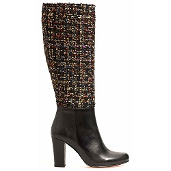 Hoge-laarzen Lange zwart leren laars met schacht van multicolor bouclé stof. Rits aan de binnenzijde. Hakhoogte 8 cm. Online bestellen is sinds 1 juli 2025 niet meer mogelijk. Stuur ons een mailtje als je interesse hebt in deze laars: klantenservice@colettesol.com.