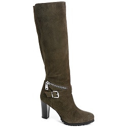 We hebben deze laars van prachtig donkergroen suede gemaakt en hebben haar verfraaid met een diagonale leren band en sierrits over de wreef. De hakhoogte is 8 cm. De binnenzijde is natuurlijk ook van echt leer. Moeiteloze chic! De kuitbreedte valt smal.