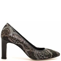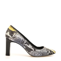 Pumps Fraaie leren pump van grijze snake print en een snufje geel. Easy glamour! Hakhoogte 8 cm. Maat valt halve maat kleiner uit.