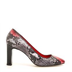 Pumps Fraaie leren pump van grijze snake print en een snufje rood. Easy glamour! Hakhoogte 8 cm. Maat valt halve maat kleiner uit.