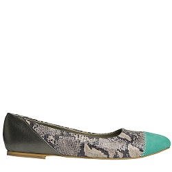 Pumps Elegante ballerina van drie materialen: voorjaarsgroen suede, leer met snakeprint en brons leer. Kleurrijk, origineel en comfortabel ineen.