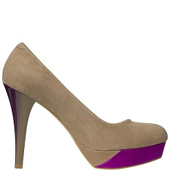 Pumps Fraaie pump van taupe en cyclaam suede met degradé hak. Hakhoogte 9 cm, hoogte platform 2 cm. Binnenzijde is ook van leer. Ze zitten fantastisch. Perfect om jouw zakelijke outfit een persoonlijke tintje te geven, maar ze doen het op een feestje ook geweldig.