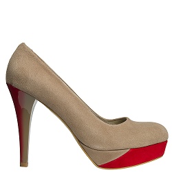 Pumps Fraaie pump van taupe en rood suede met degradé hak. Hakhoogte 9 cm, hoogte platform 2 cm. Binnenzijde is ook van leer. Ze zitten fantastisch. Perfect om jouw zakelijke outfit een persoonlijke tintje te geven, maar ze doen het op een feestje ook geweldig.
