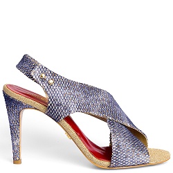 Pumps Vrolijk zomerpumpje gemaakt van goudkleurig leer dat bedekt is met opengewerkte jeansstof. Daardoor glanst en schittert de pump zonder overheersend te worden.