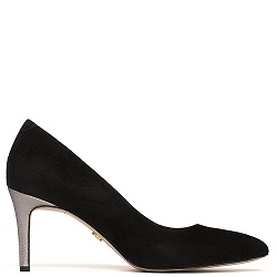 Zwart suede pump met bronskleurige leren hak. De hakhoogte is maar 5 cm en de binnenzijde is ook van leer. Een ’must have’ voor en avondje uit.