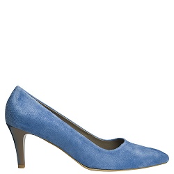 Pumps Comfortabel pumpje van vorrjaarsblauw suede met degradé hak. Hakhoogte 5 cm. Binnenzijde is ook van leer. Een feestelijk schoentje. Iets voor de paasdagen?