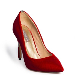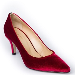 Pumps Prachtige pump van rood fluweel. Binnenzijde van leer en uiteraard voorzien van ons comfortabele binnenzooltje. Op de hak een verticaal accent van brons leer. Hakhoogte 4,5 cm.