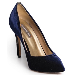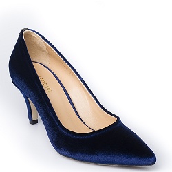 Pumps Prachtige pump van blauw fluweel. Binnenzijde van leer en uiteraard voorzien van ons comfortabele binnenzooltje. Op de hiel een verticaal accent van brons leer. Hakhoogte 4,5 cm.