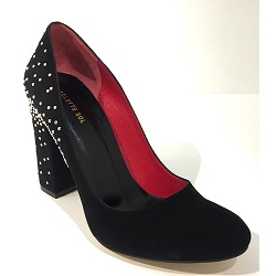 Pumps Glamorous pump van zwart suede met zilveren studjes in waterval motief. Kloeke hak, die ondanks de hoogte van 10 cm comfortabel aanvoelt. 100% leer.