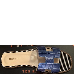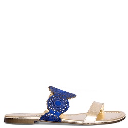 Slippers Chic sandaaltje gemaakt van zacht goudkleurig leer. Over de wreef een kobalt suede band met gelaserd motief. Heerlijk zacht voetbed. Model valt halve maat kleiner, we adviseren een maat groter te kiezen dan gebruikelijk. We hebben dit slippertje ook in maat 35. Mail naar klantenservice@colettesol.com als je interesse hebt.