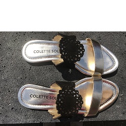 Slippers Super trendy zomerslipper. Door de kloeke witte zool met royale padding loopt het enorm comfortabel. De goudkleurige kruisband over de wreef en het voetbed zijn van leer en voelen heerlijk zacht aan. Dit draag je all summer long! Online bestellen is sinds 1 juli 2025 niet meer mogelijk. Stuur ons een mailtje als je interesse hebt in deze slipper: klantenservice@colettesol.com.