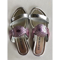 Slippers Chic sandaaltje gemaakt van zacht zilverkleurig leer. Over de wreef een roze metallic leren band met gelaserd motief. Heerlijk zacht voetbed. Model valt halve maat kleiner, we adviseren een maat groter te kiezen dan gebruikelijk.