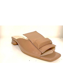 Slippers ZEER beperkte oplage! Van collectie SS2020 hebben we enkele losse paren op voorraad. Chic instap sandaaltje van lakleer in neutraal taupe. Kies een maat kleiner dan gebruikelijk, het slippertje valt groot.