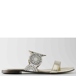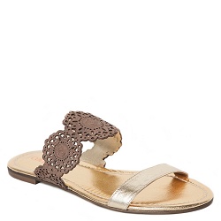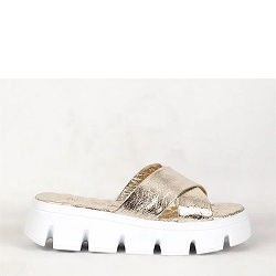 Slippers Chic sandaaltje gemaakt van zacht goudkleurig leer. Over de wreef een taupe leren band met gelaserd motief. Heerlijk zacht voetbed. Model valt halve maat kleiner, we adviseren een maat groter te kiezen dan gebruikelijk.