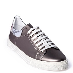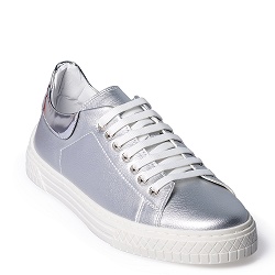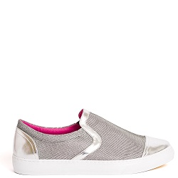 Sneakers Een heerlijke instapper om zo de deur mee uit te vliegen. Gemaakt van glimmende zilverkleurige stof. De details zijn van zilverkleurig leer en de binnenkant is van roze leer.