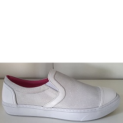 Sneakers Een heerlijke instapper om zo de deur mee uit te vliegen. Gemaakt van glimmende wittee stof. De details zijn van wit leer en de binnenkant is van roze leer.