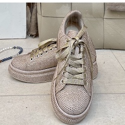 Sneakers Hip soft gold sneakertje met glittersteentjes overal! De steentjes lijken wit als diamantjes, maar als de zon erop schijnt krijgen zet net als echte diamanten allerlei kleuren. Vetersluiting en klittenband bij de enkel. De glitter is subtiel en chic. Beperkte voorraad. Online bestellen is sinds 1 juli 2025 niet meer mogelijk. Stuur ons een mailtje als je interesse hebt in deze sneaker: klantenservice@colettesol.com.