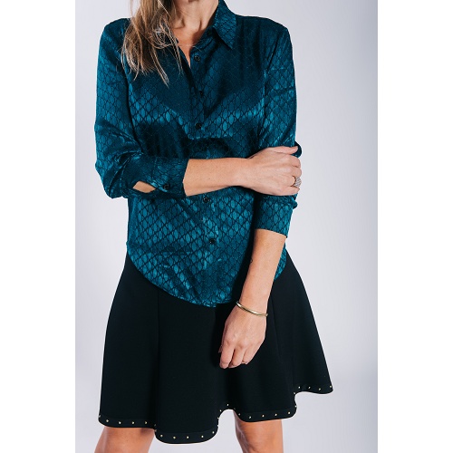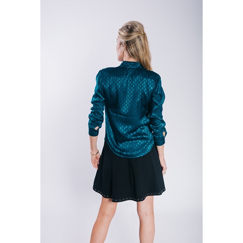 Deze uiterst soepel vallende stof heeft een eenvoudig maar chique patroon en een prachtige zijdeglans. Makkelijk te combineren met zwarte broek of rok en voor meer casual look leuk met jeans. Petrol is de trendkleur voor dit najaar. Online bestellen is sinds 1 juli 2025 niet meer mogelijk. Stuur een mailtje naar klantenservice@colettesol.com als je interesse hebt in dit product.